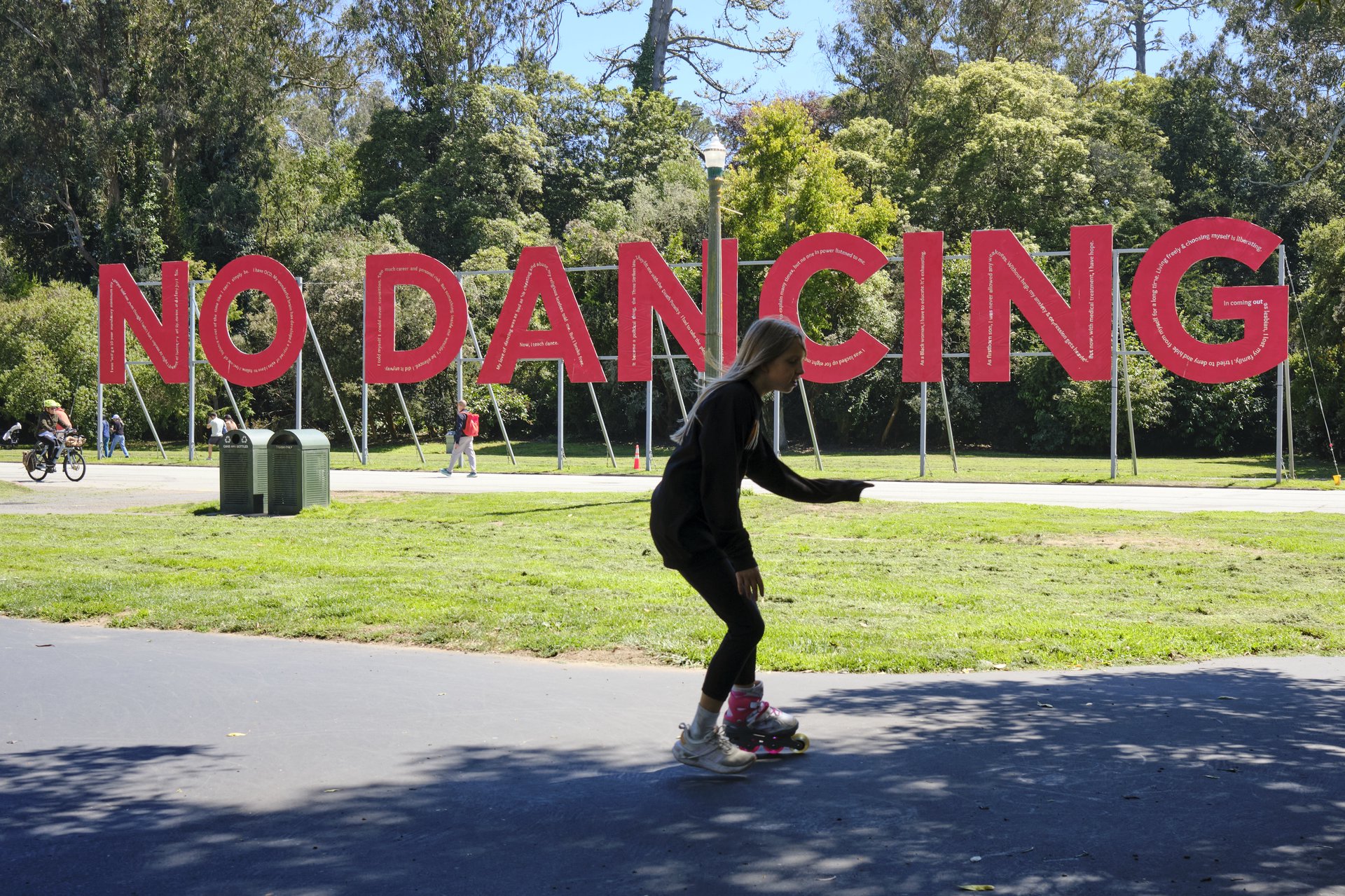 A skates in front of No Dancing sign.