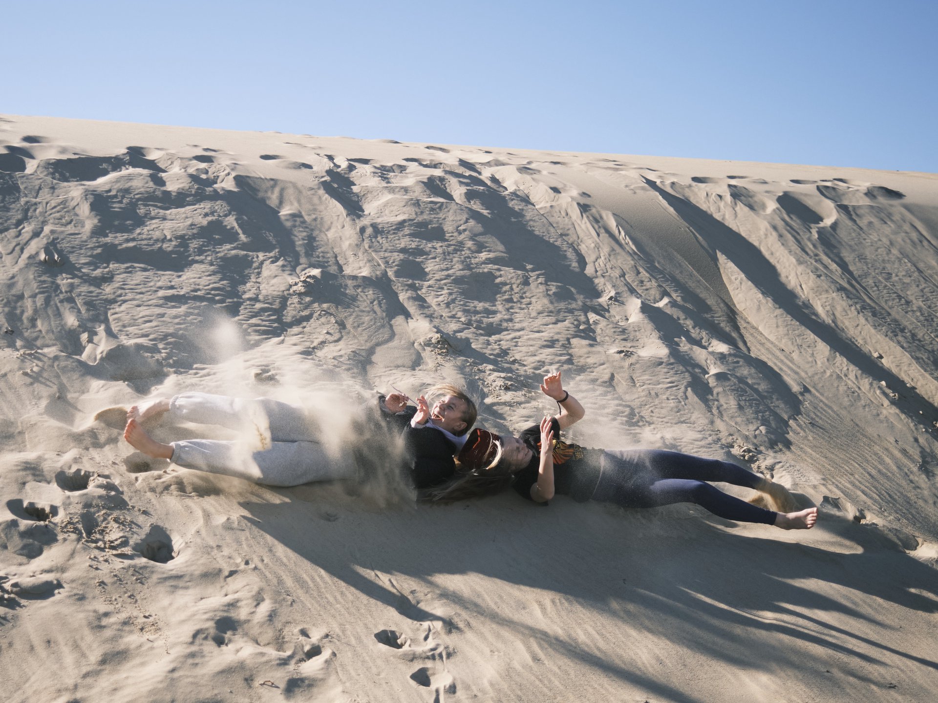 Girls rolling down sand dunes