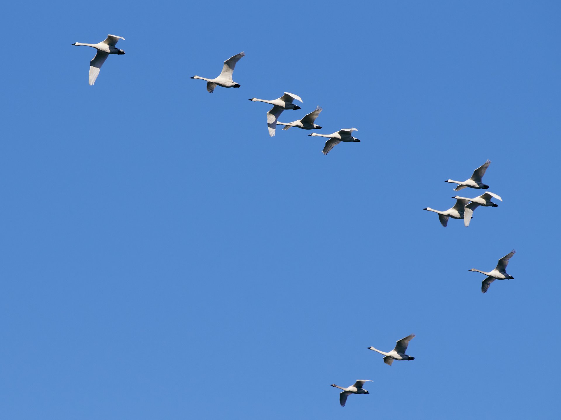 Tundra swans flying overhead